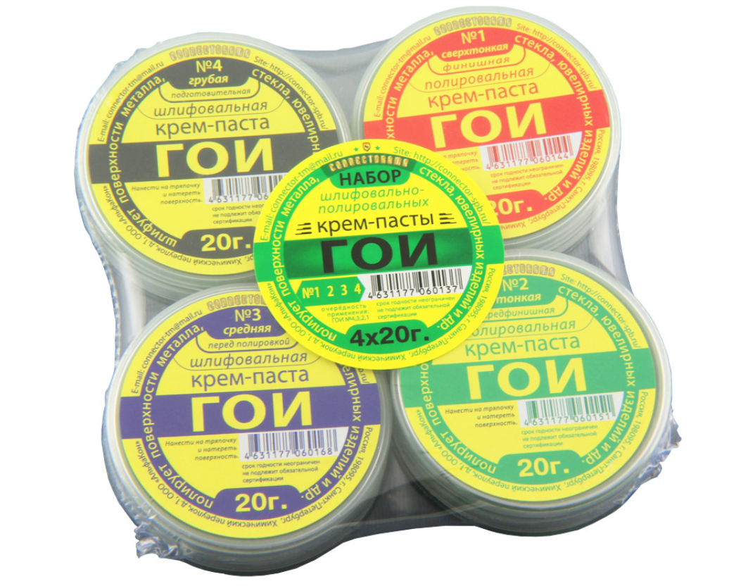 Набор крем-пасты ГОИ - 4 баночки по 20г применяется для полировки царапин разных размеров. Чтобы удалить самые крупные царапины и неровности берётся самая грубая паста. Она шлифует и выравнивает, но после неё самой остаётся поверхность, требующая обработки пастой с более мелким зерном. А после этой располировывается ещё более мелкой пастой, а потом ещё более мелкой, пока не дойдёт до финишной.